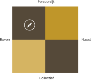 In het voorbeeld hiernaast wordt een waardenpositie getoond waarin de leraar meer naast de leerling staat, maar waarin het doel van het onderwijs het midden houdt tussen collectief bepaald en persoonlijk bepaald.